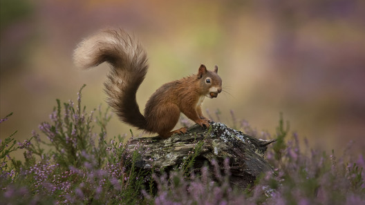 Red squirrel on a tree stump among autumn heathers — wildlife nature photo by Kieran O Mahony