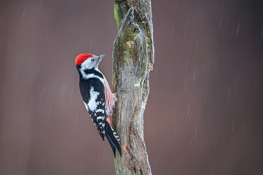Woodpecker clinging to old tree branch in rain with morning light nature photo by Kieran O Mahony